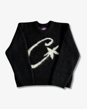 Knit, fuzzy, boxy sweater with our classic Cosmic "C" logo. Mohair style feel, ribbed collar and hems. Unisex.