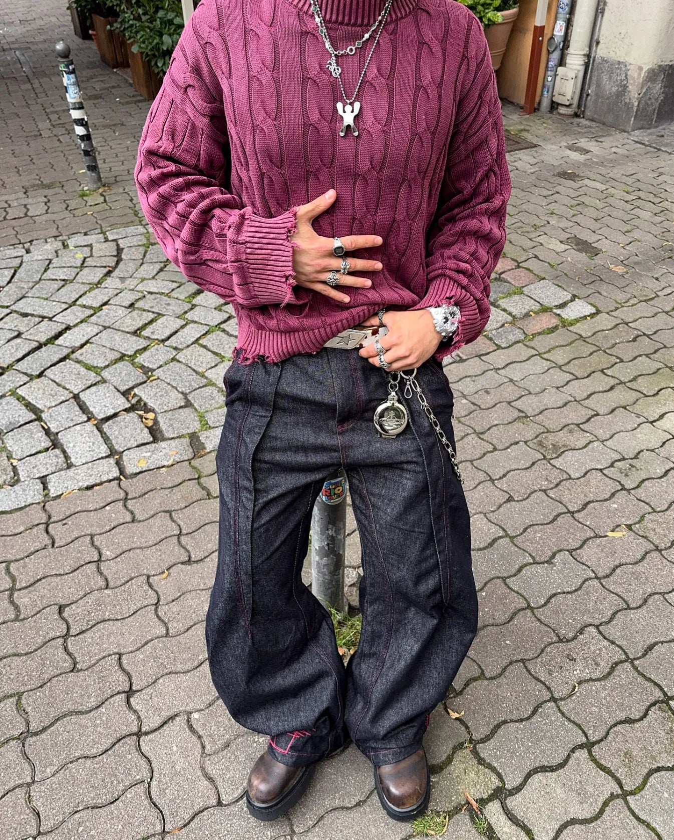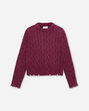 Classic cable knit, boxy sweater with distressing throughout. Comfy knit texture, ribbed collar and hems. Unisex.