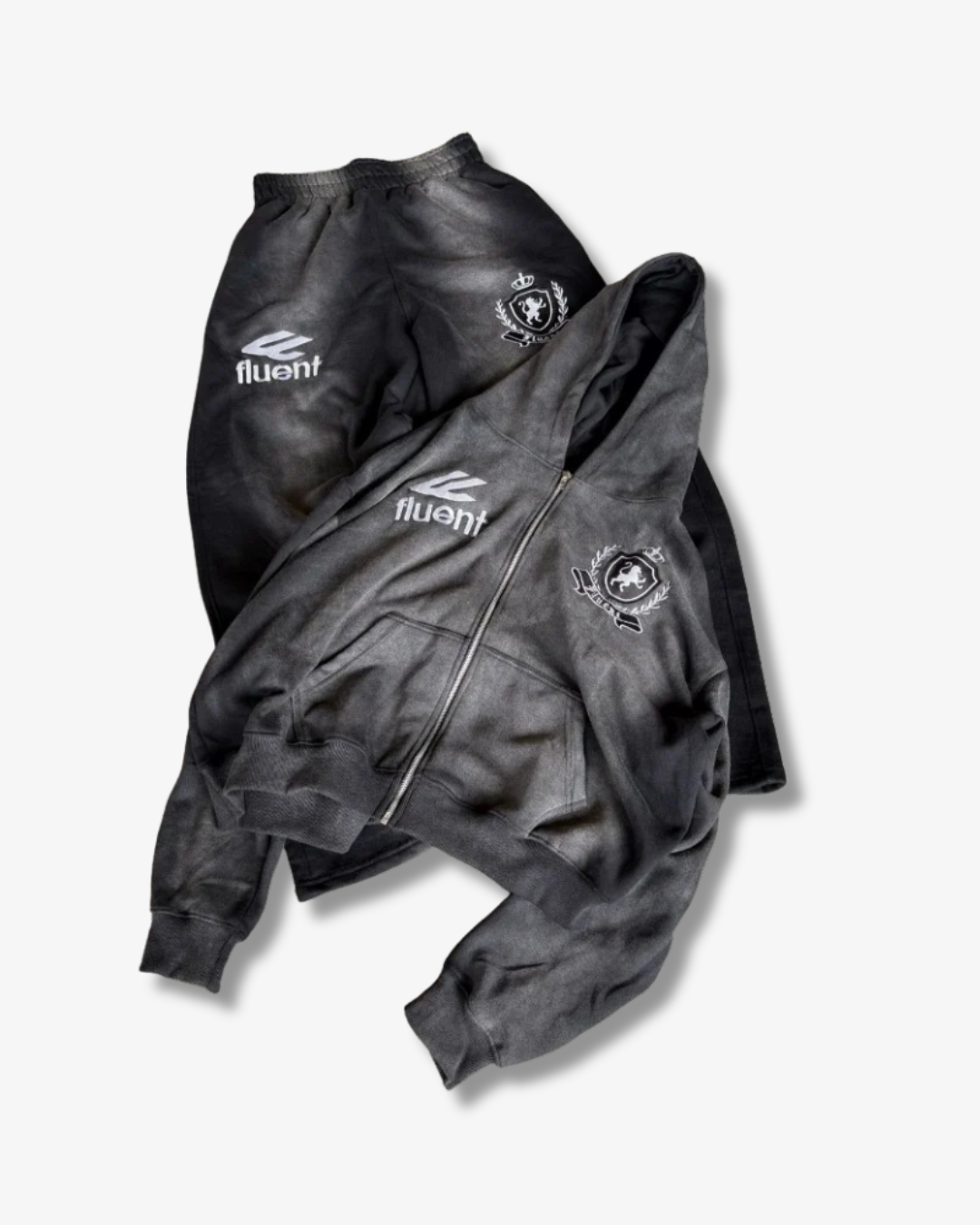 This set features a perfectly faded hoodie and pair of sweatpants with small "fluent" emblems. Hoodie is cut wide through the body with dropped shoulders and a roomy hood. Sweatpants have a wide leg, straight fit that doesn't taper.