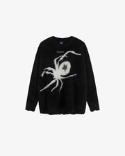 Black knit sweater with a large fuzzy spider graphic and our signature star, boxy fit, and dropped shoulders. Soft, mid-heavy knit with rib trims. Unisex.