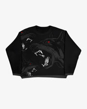 Black boxy sweater with a wraparound triple-wolf graphic and red-eye accents, layered hem, and soft mid-heavy fleece. Unisex.
