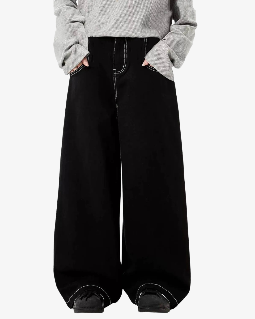 Like a classic pair of wide-leg black denim with clean lines. Crisp contrast stitching traces the pockets, fly, and hems, giving the silhouette a subtle edge that works with anything from oversized tees to cropped hoodies.