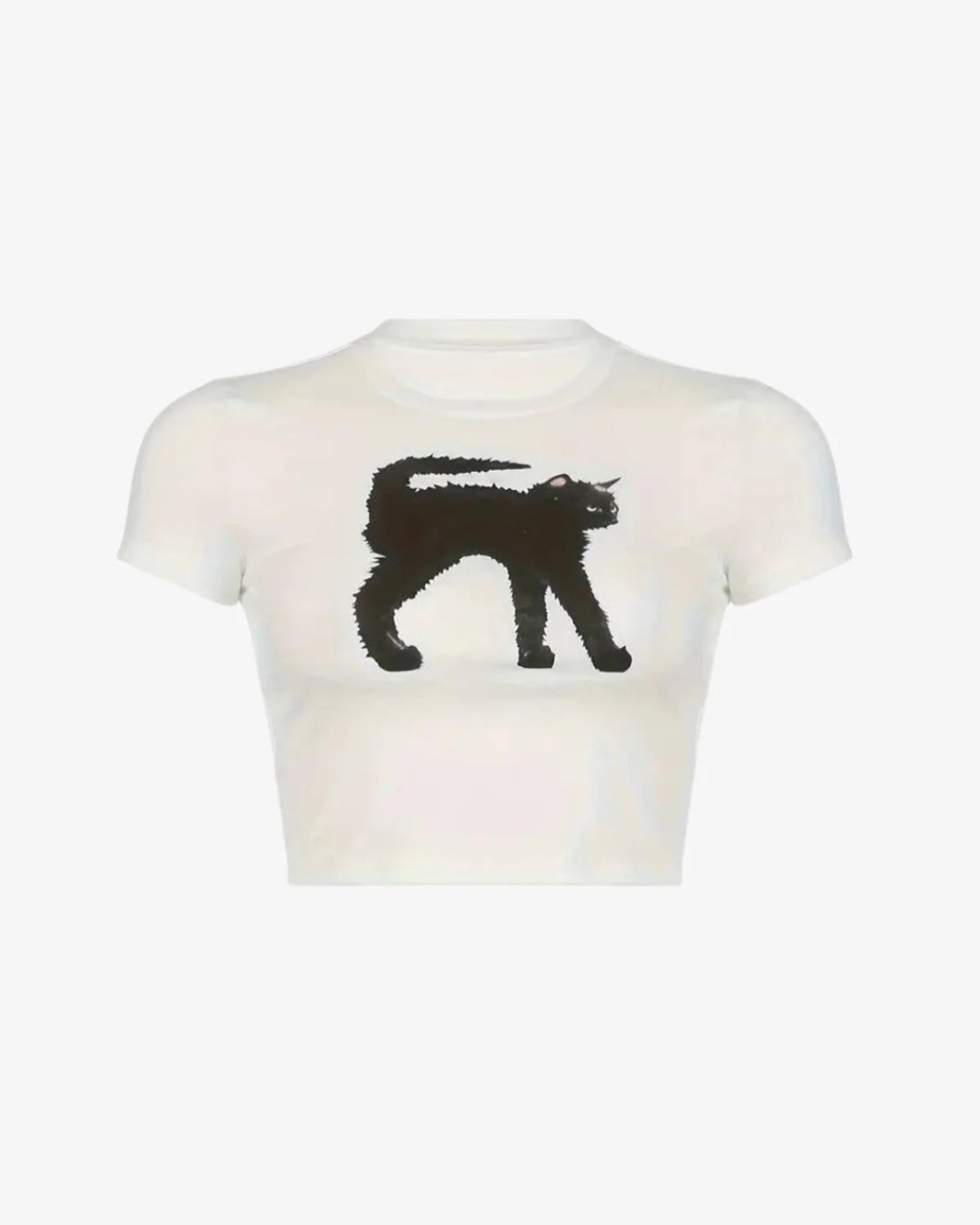 Cropped baby tee with a black cat graphic. Soft stretch cotton blend and a fitted silhouette. Easy everyday styling.