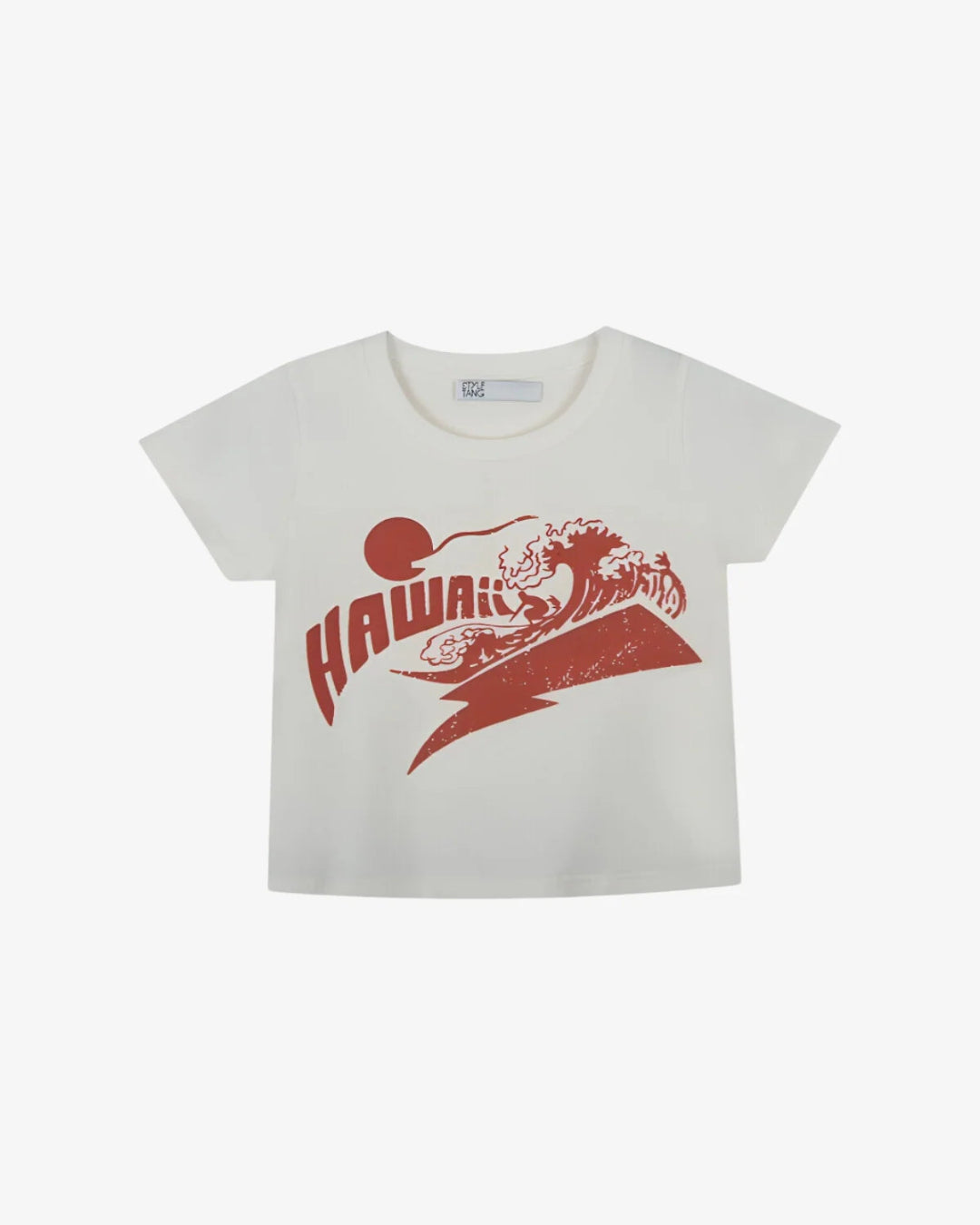 The perfect graphic baby tee. Tight fit, cropped on body and short sleeves, bright orange "hawaii" front graphic.