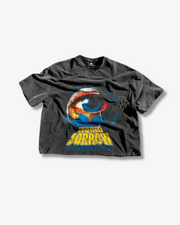 Vintage-inspired look, distressed finish, bold graphic design, heavyweight cotton feel, classic streetwear style.